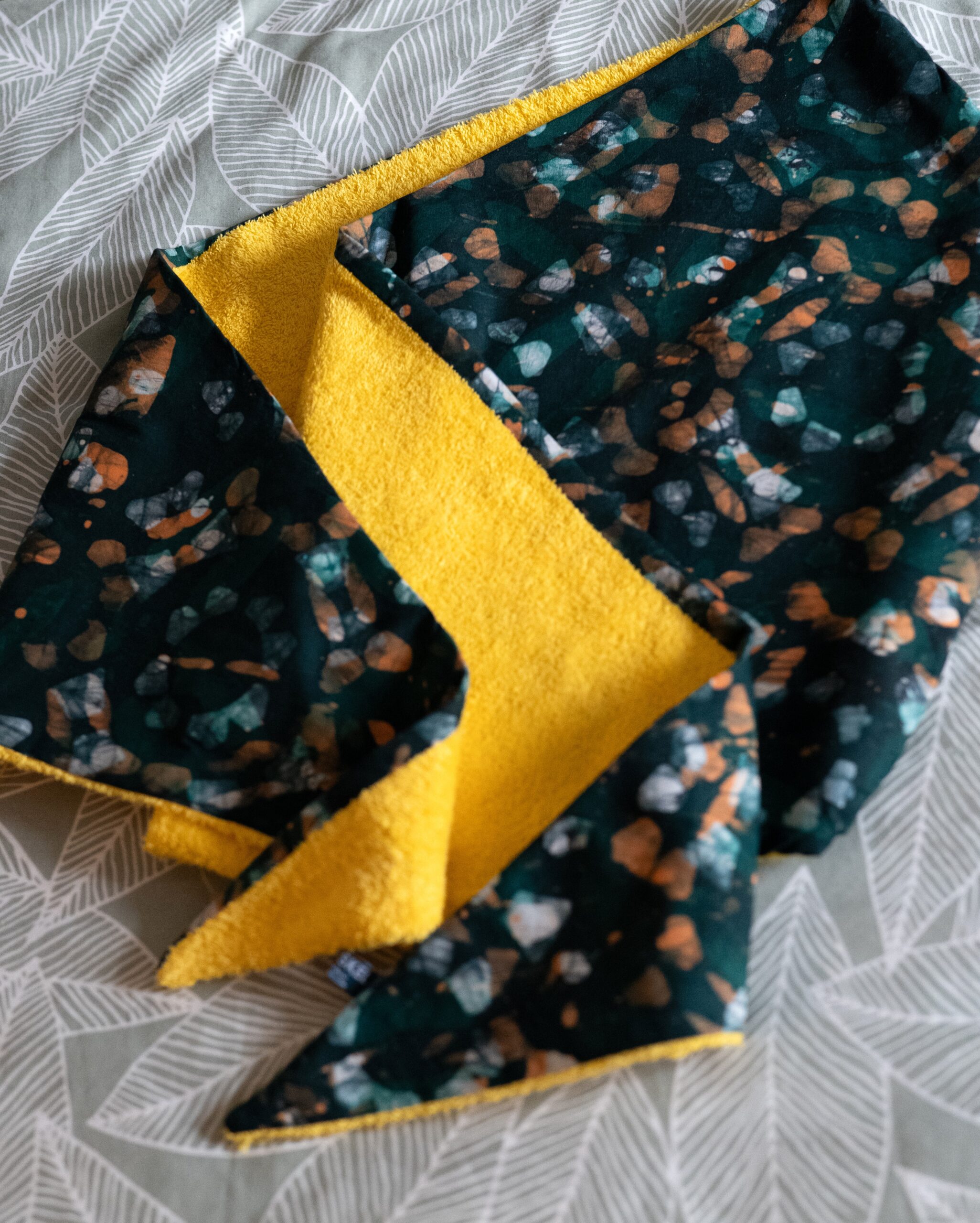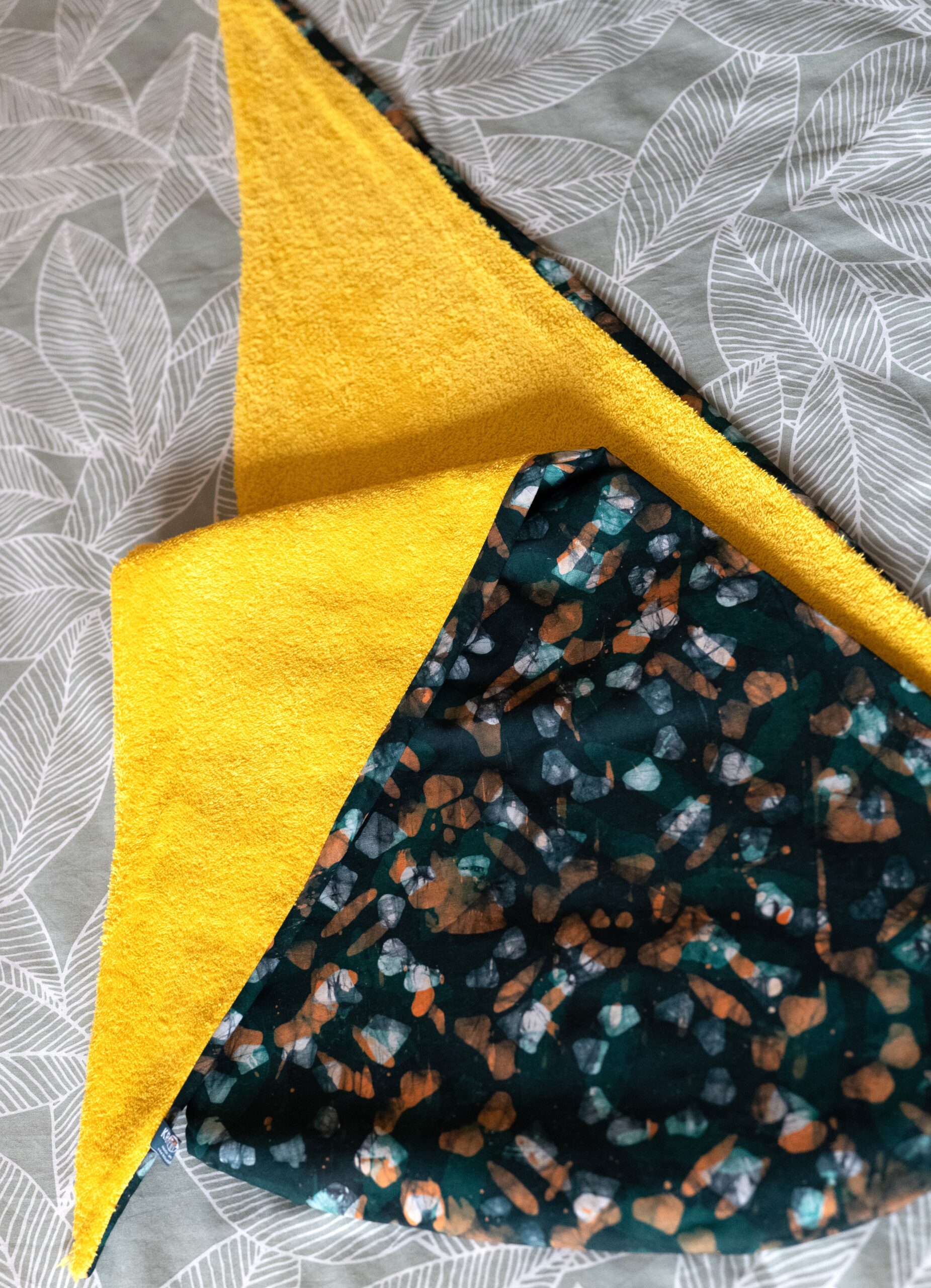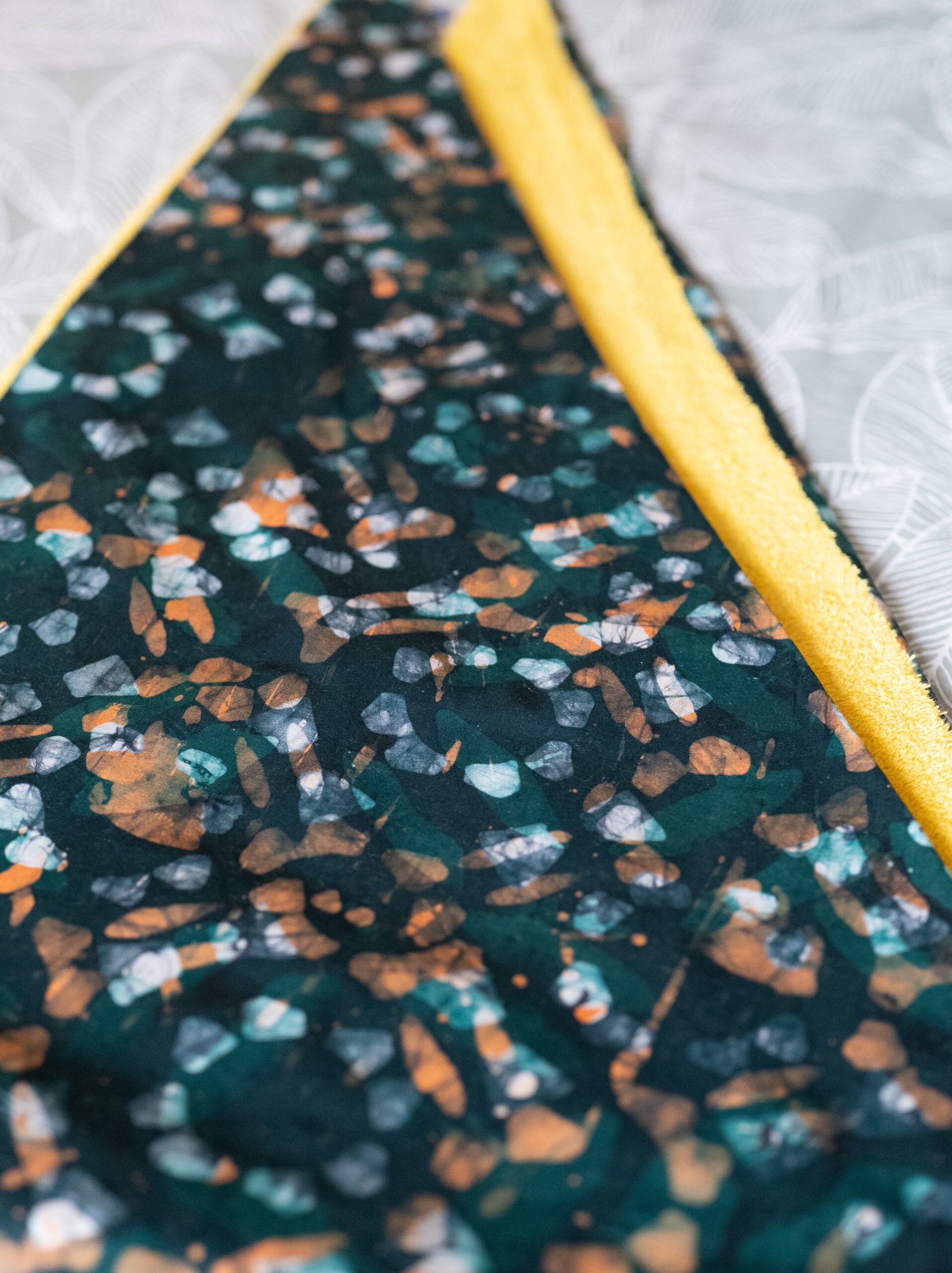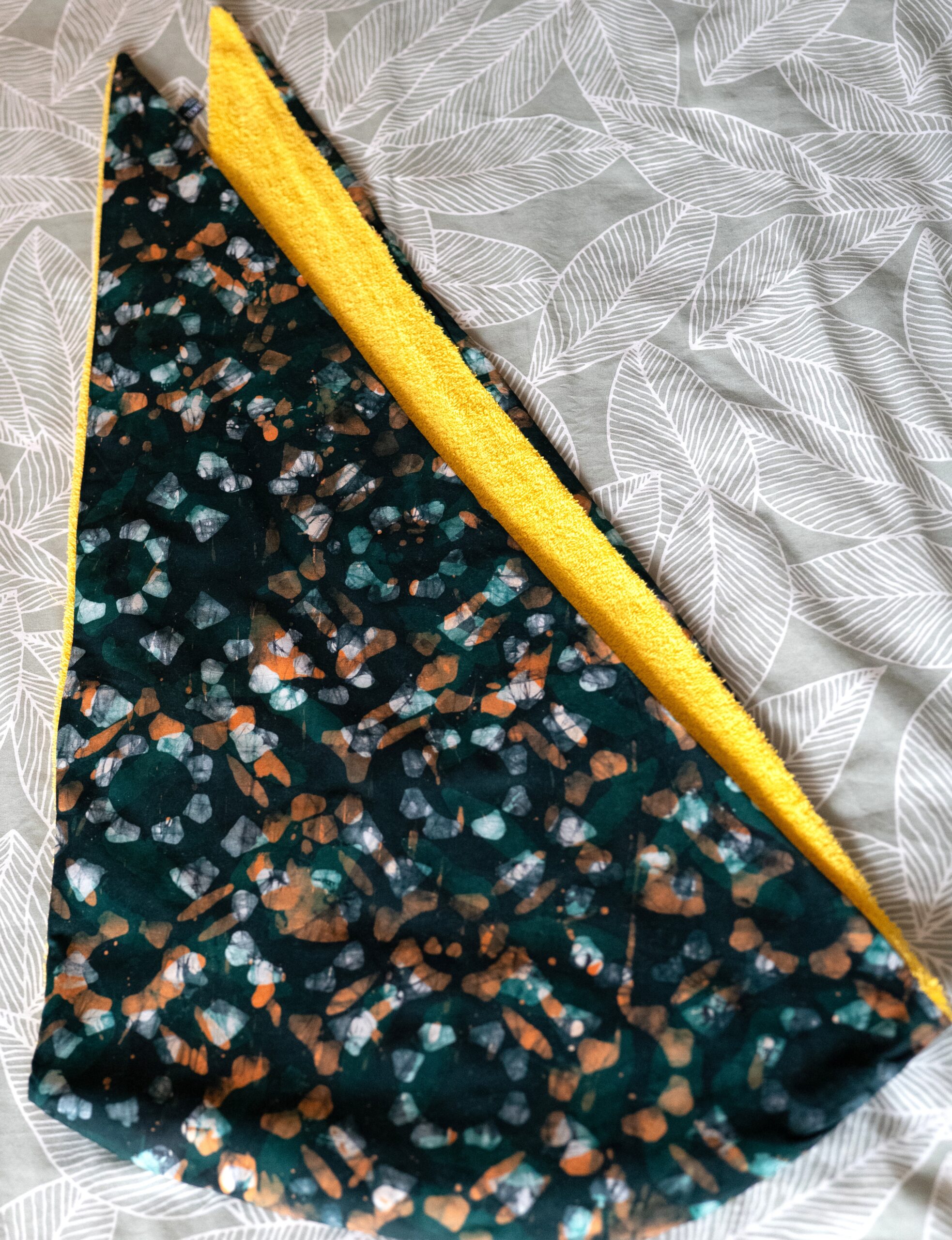 Entièrement doublé et orné de tissus teintés artisanalement, il est conçu comme une pièce signature Kroskel : simple à nouer, élégant à porter, et assez large pour accueillir toutes les chevelures.