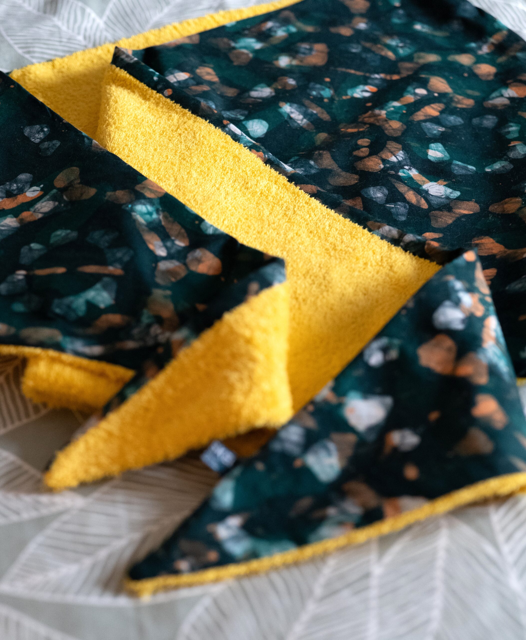 Le tissu en coton, blanc à l’origine, est ici teinté avec une technique de cire brisée.