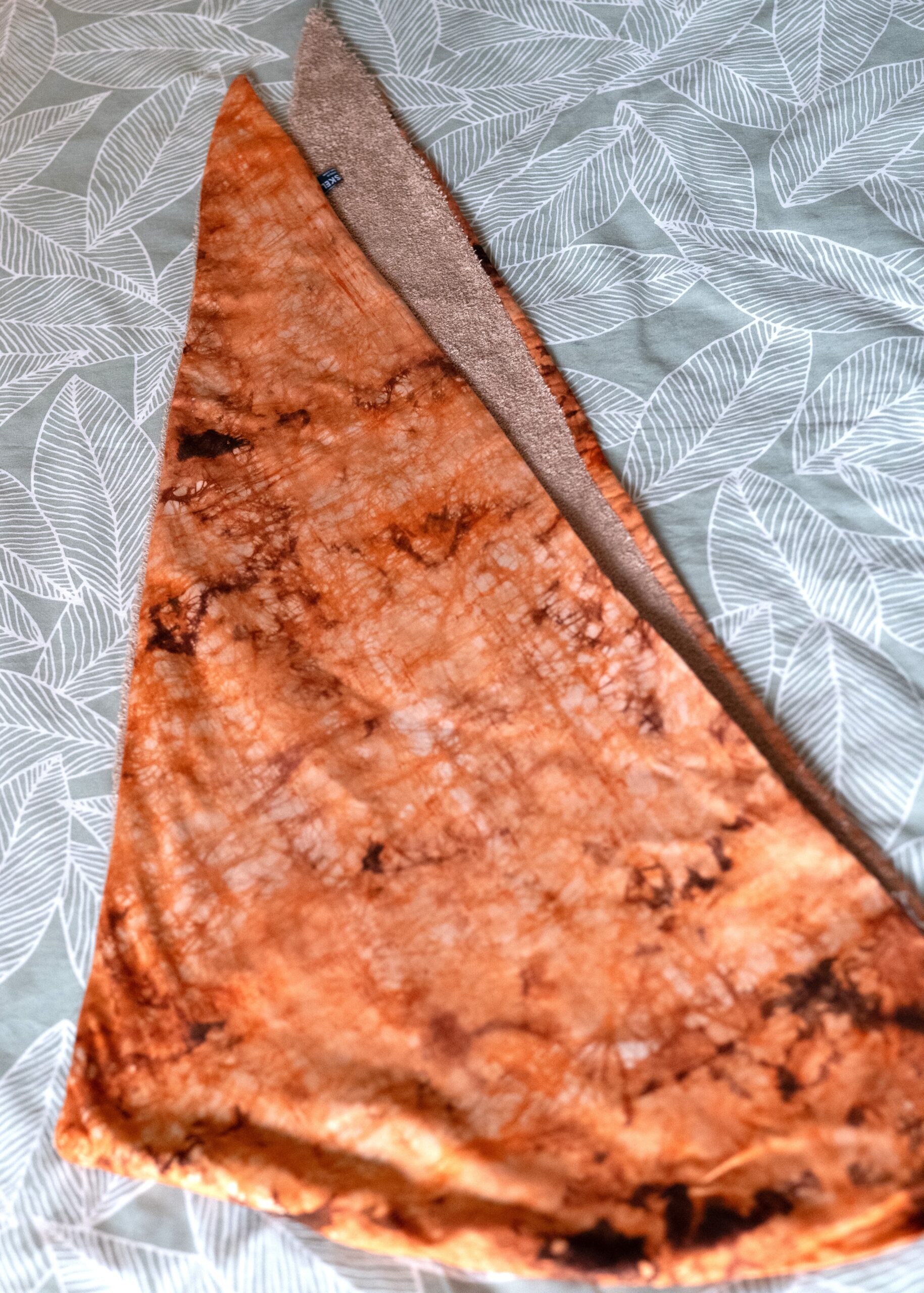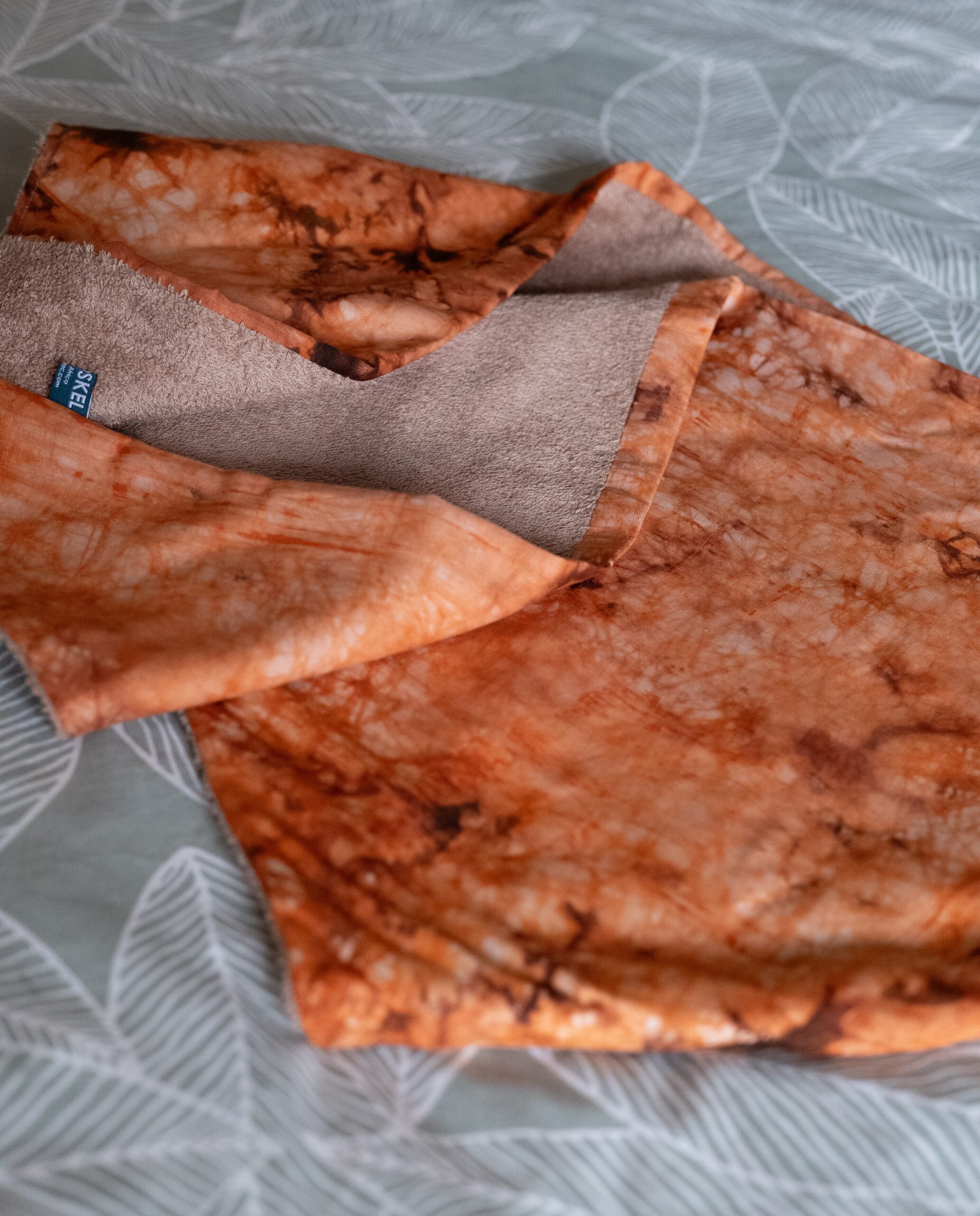 Le tissu en coton, blanc à l’origine, est ici teinté avec une technique de cire brisée.