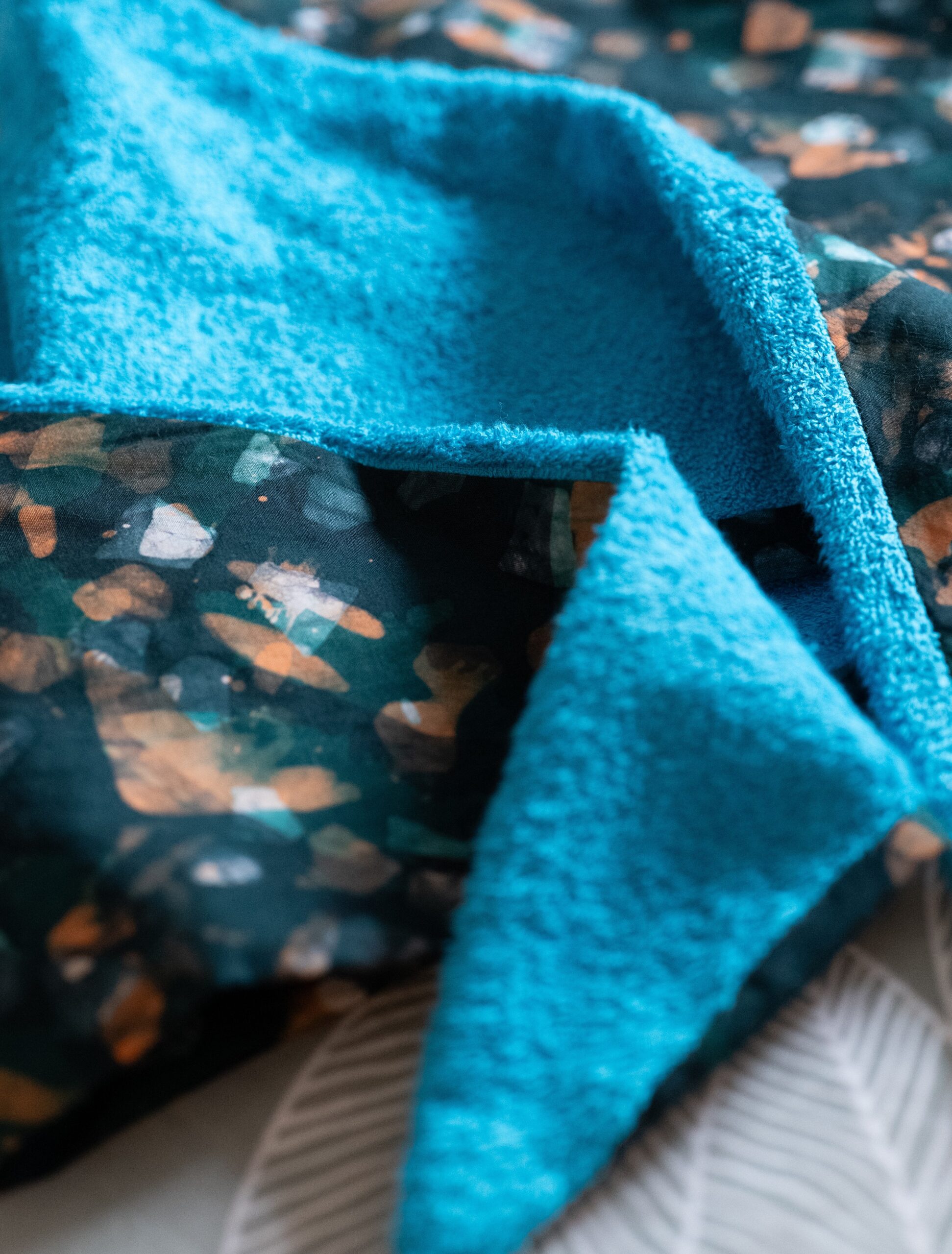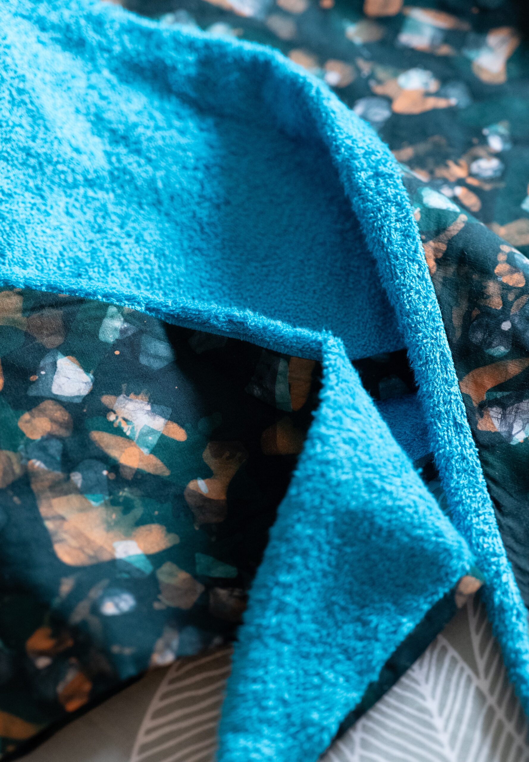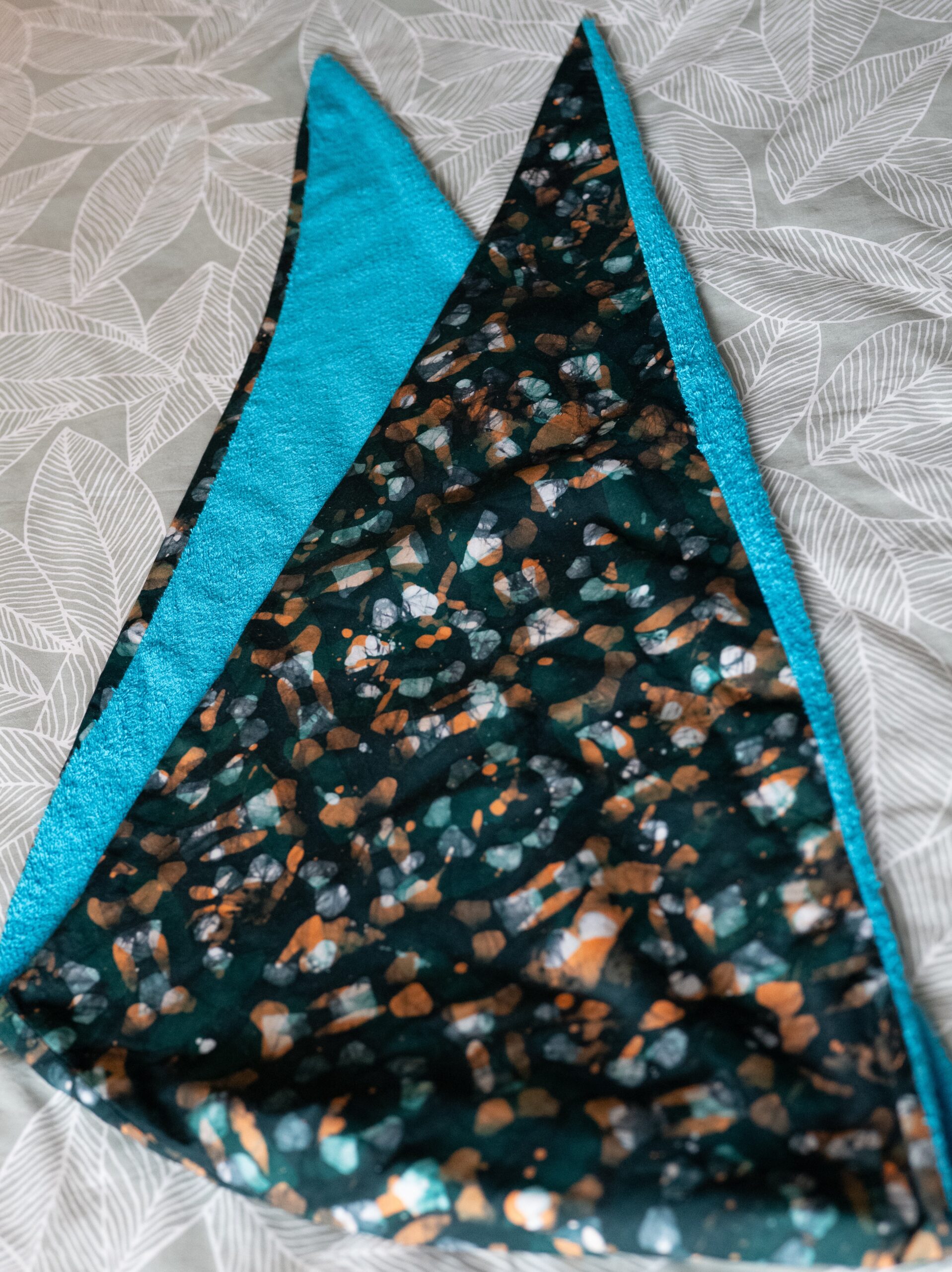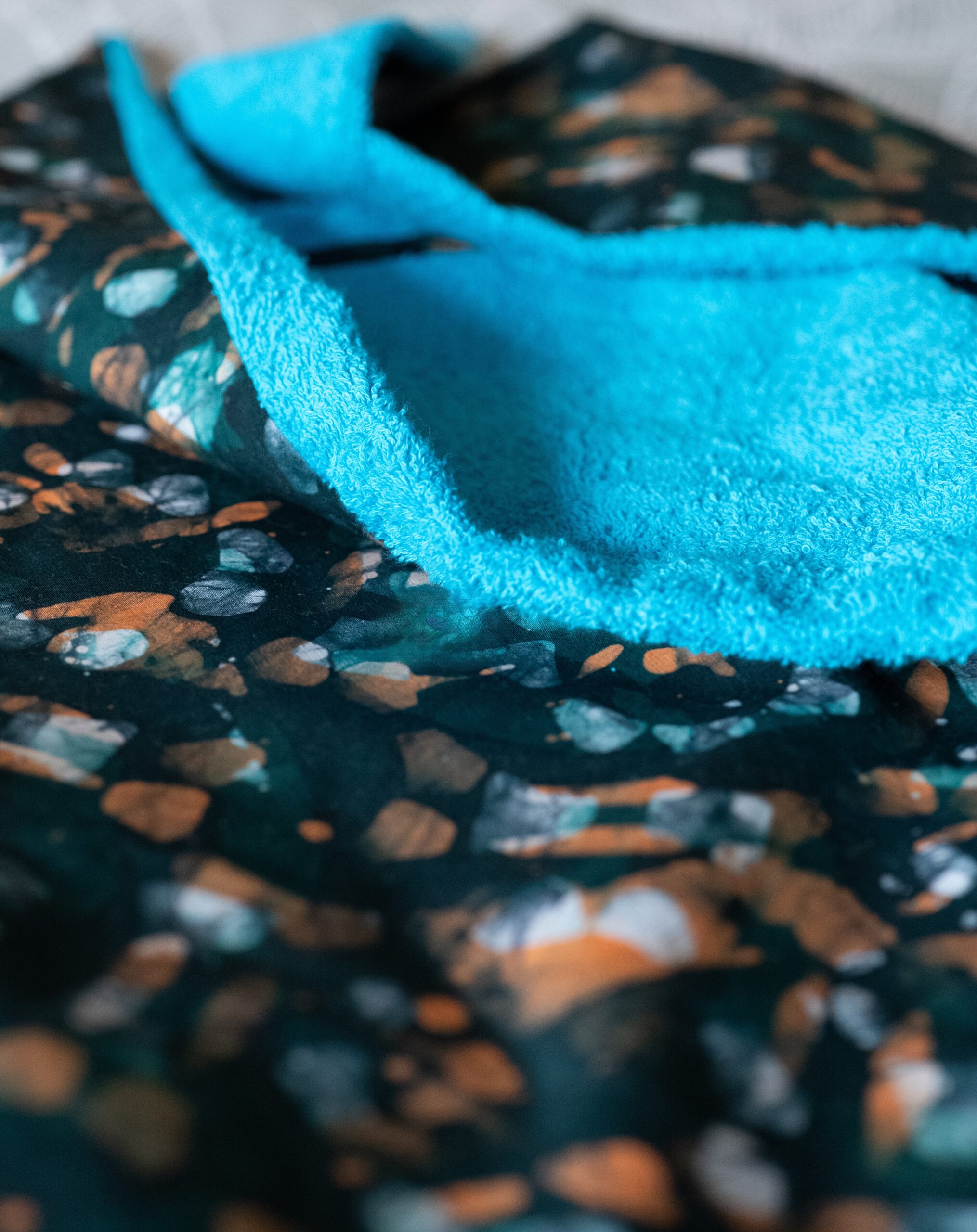 Le tissu en coton, blanc à l’origine, est ici teinté avec une technique de cire brisée.