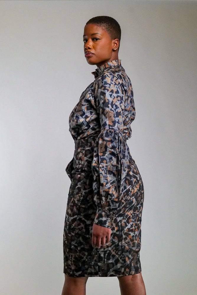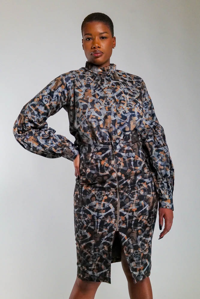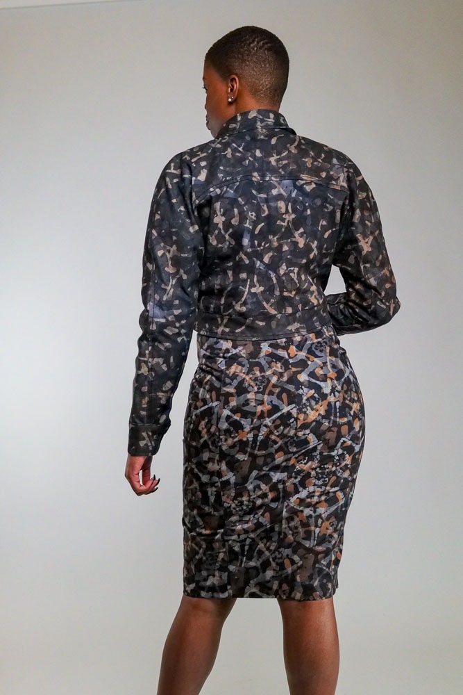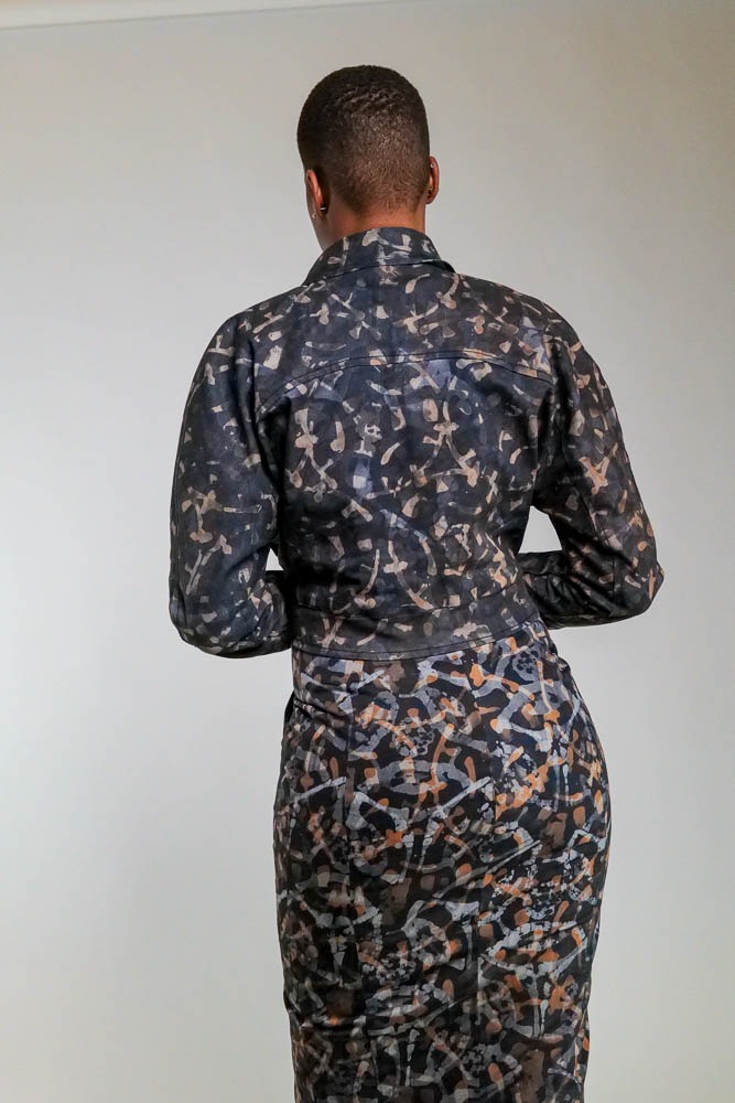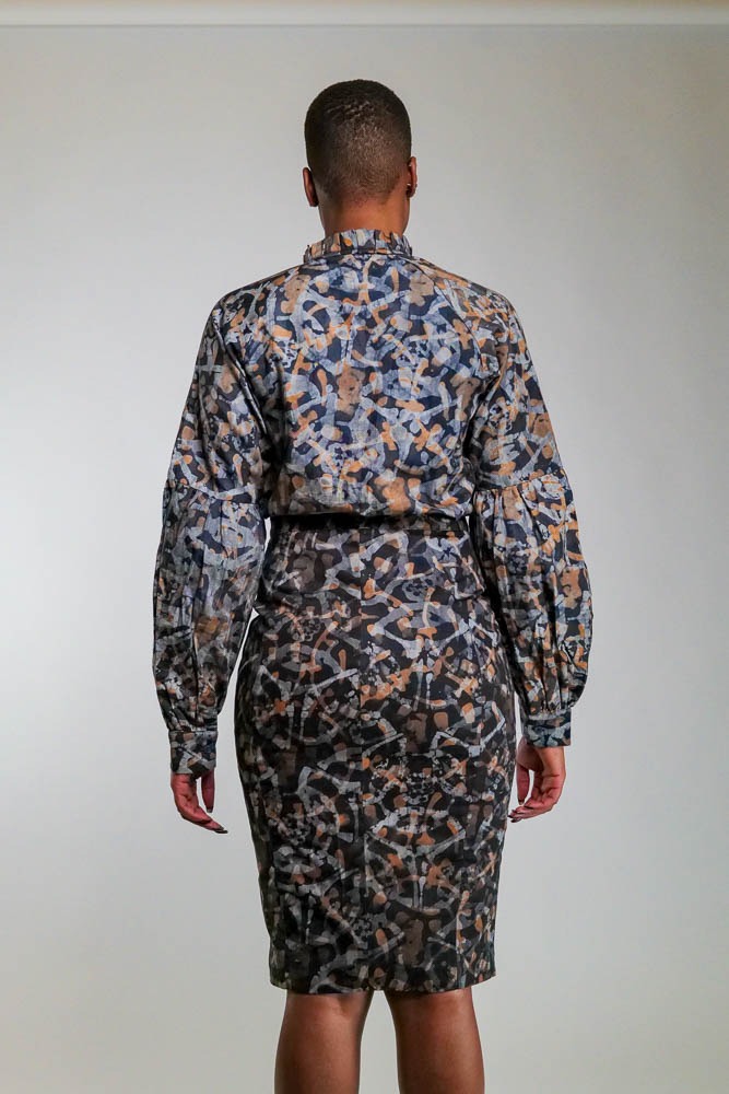 Ce coton glacé léger est teinté ici avec deux techinques. La première, appelée shibori, consiste à plier selon certaines régles le tissu jusqu’à en faire un petit rectangle, attacher l’ensemble et plonger dans la teinture. La deuxième, appelée “salade”, consiste à faire des petites montagnes ou paquets de tissu en tirant un bout vers le haut et en passant la teinture sur les sommets des montagnes.