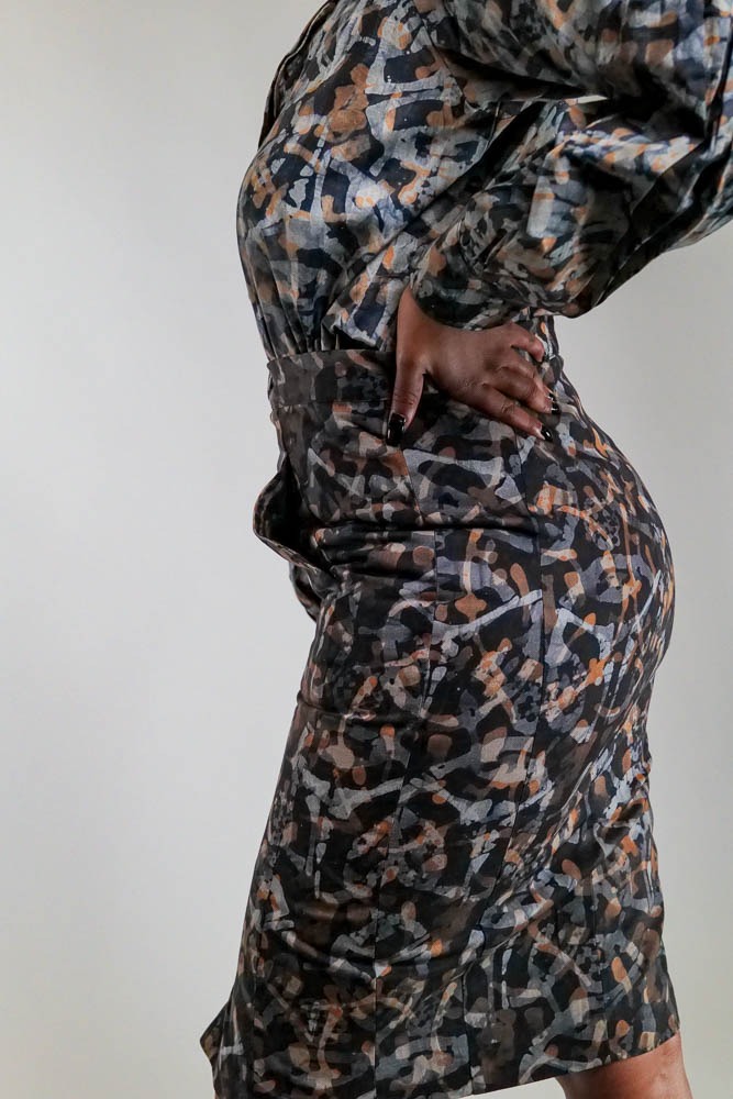 Un pantalon confortable à pattes d’éléphant, ou communément appelé “pattes d’eph”, c’est un must dans le garde-robe, ne trouvez-vous pas ? Ici, il permet d’interpréter le fil conducteur “trapèze” avec un pantalon qui reste près du corps jusqu’à la taille, pour s’élargir, en forme de trapèze (isoscèle, pour être exacte) jusqu’aux pieds qu’il peut délicatement masquer grâce à sa grande largeur. C’est, sans contexte, une pièce douce aux lignes du corps et soyeuse sur la peau : tout pour plaire. Ici, elle est associée à un crop top chemise sans manches à élastique à la taille.