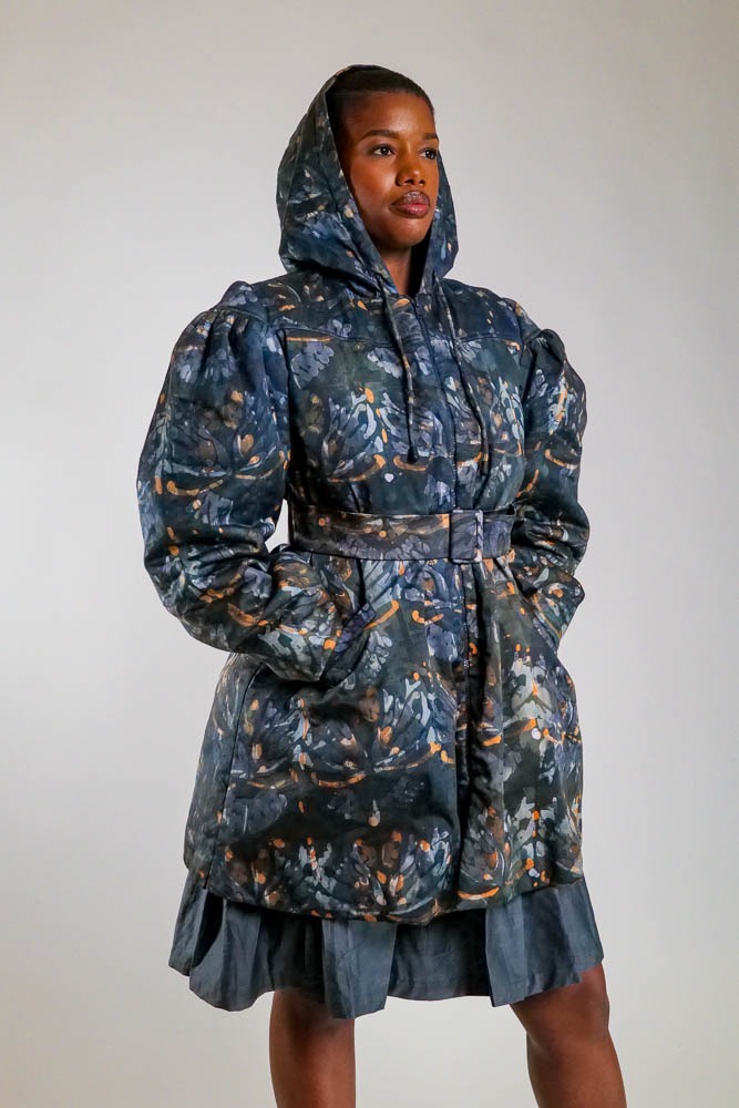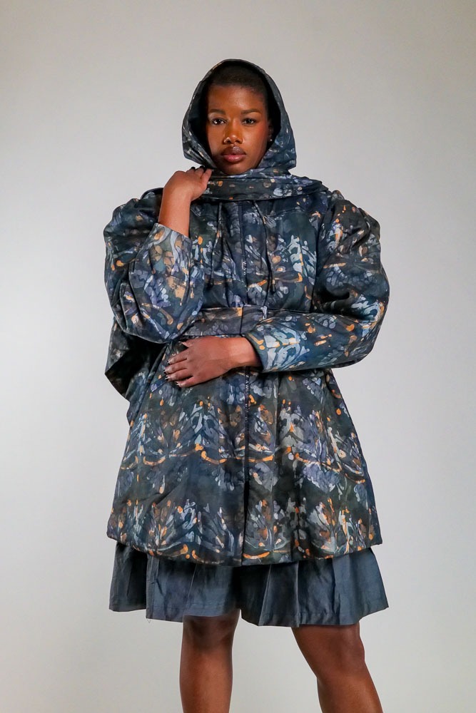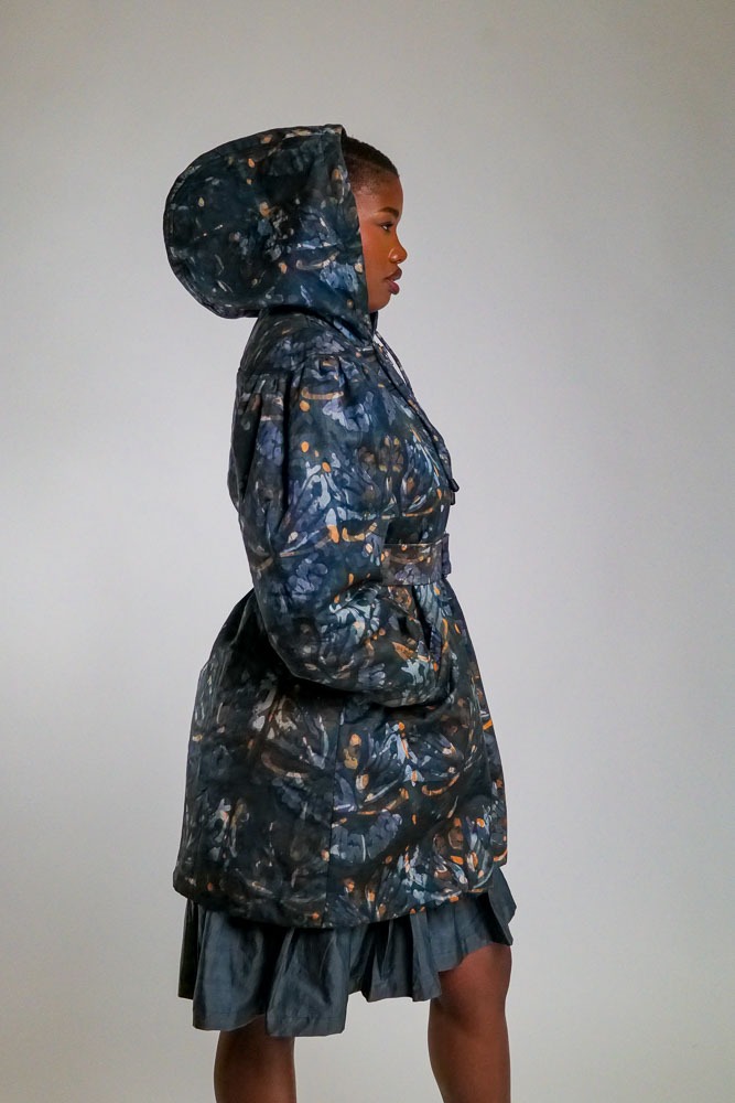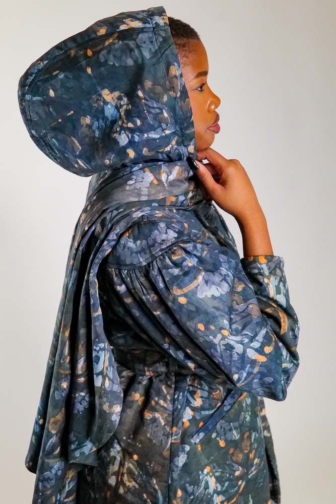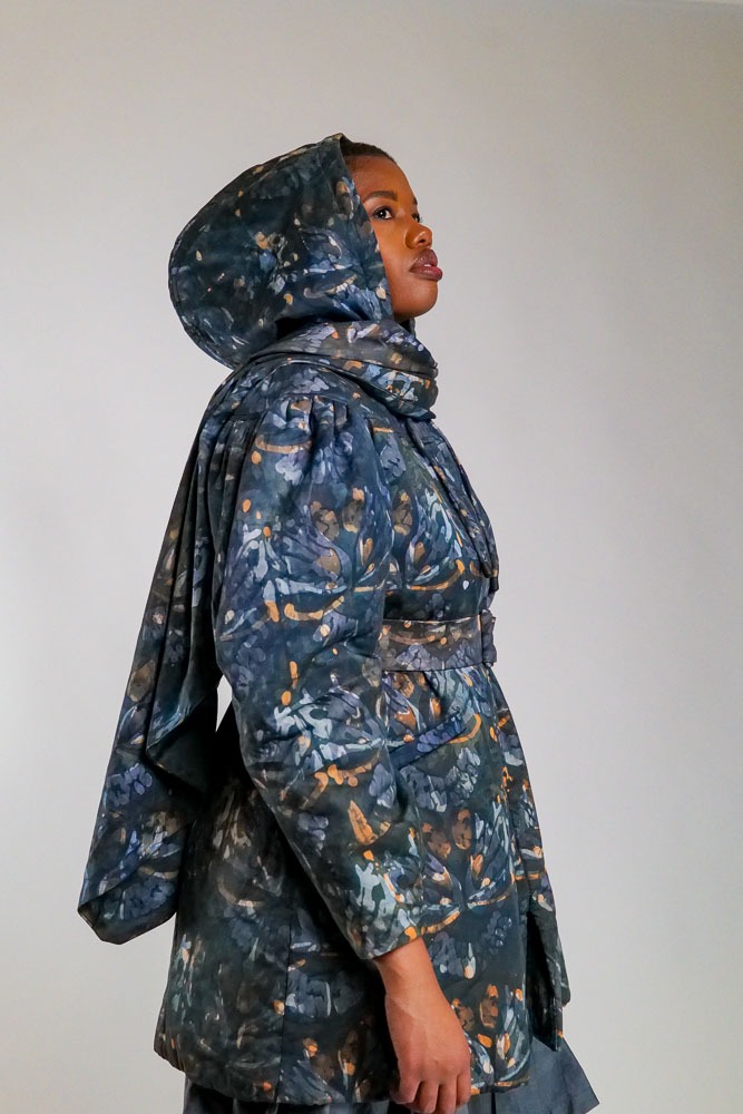 Pièce enveloppante et ceinturée, capuche oversized, écharpe intégrée amovible.