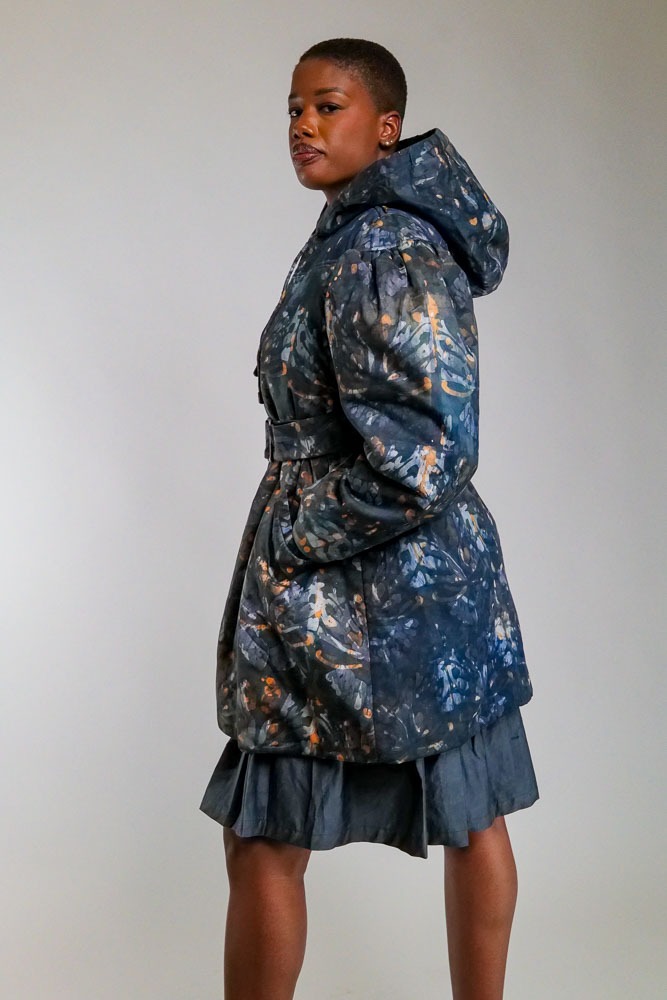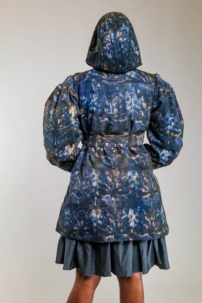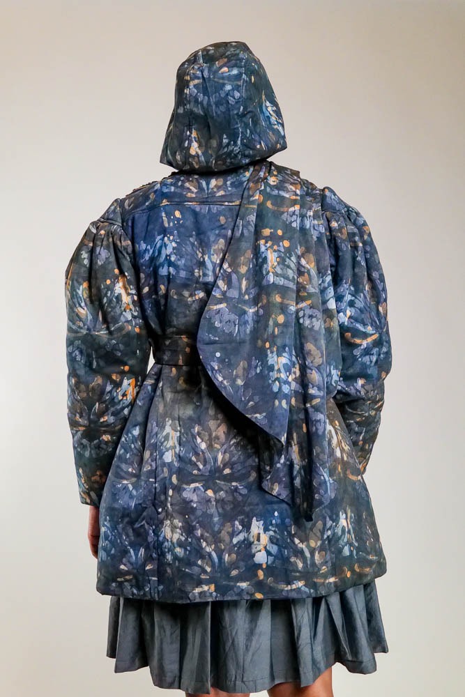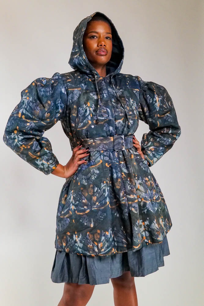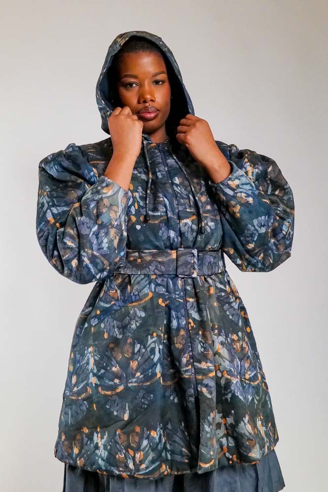 Pièce enveloppante et ceinturée, capuche oversized, écharpe intégrée amovible.