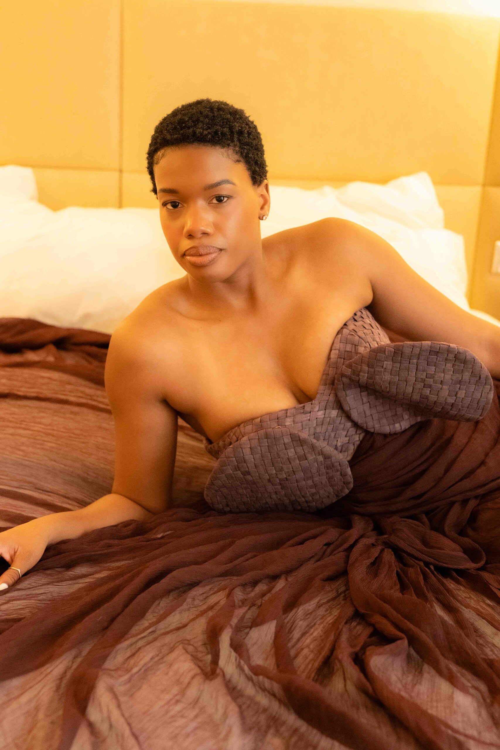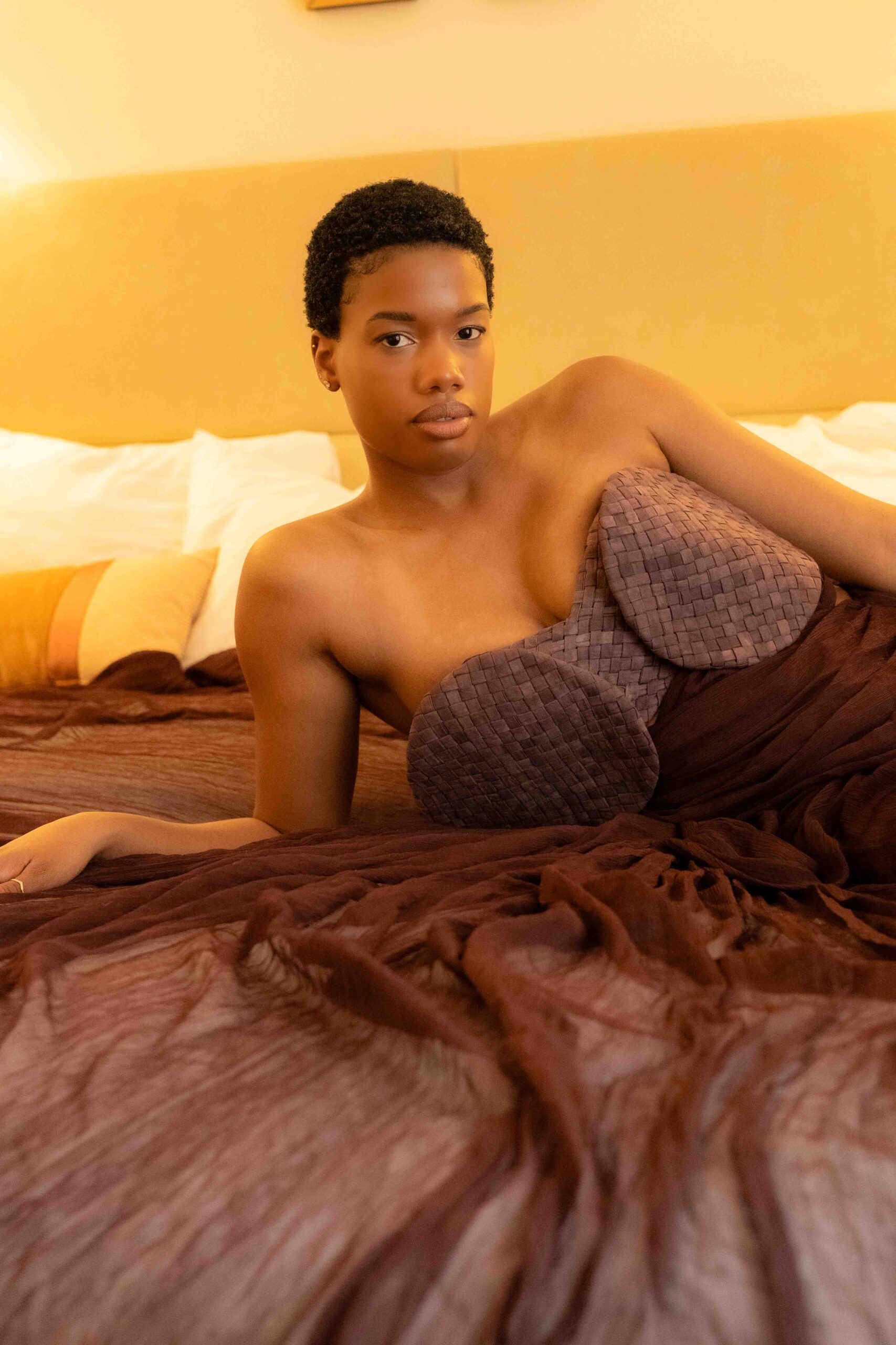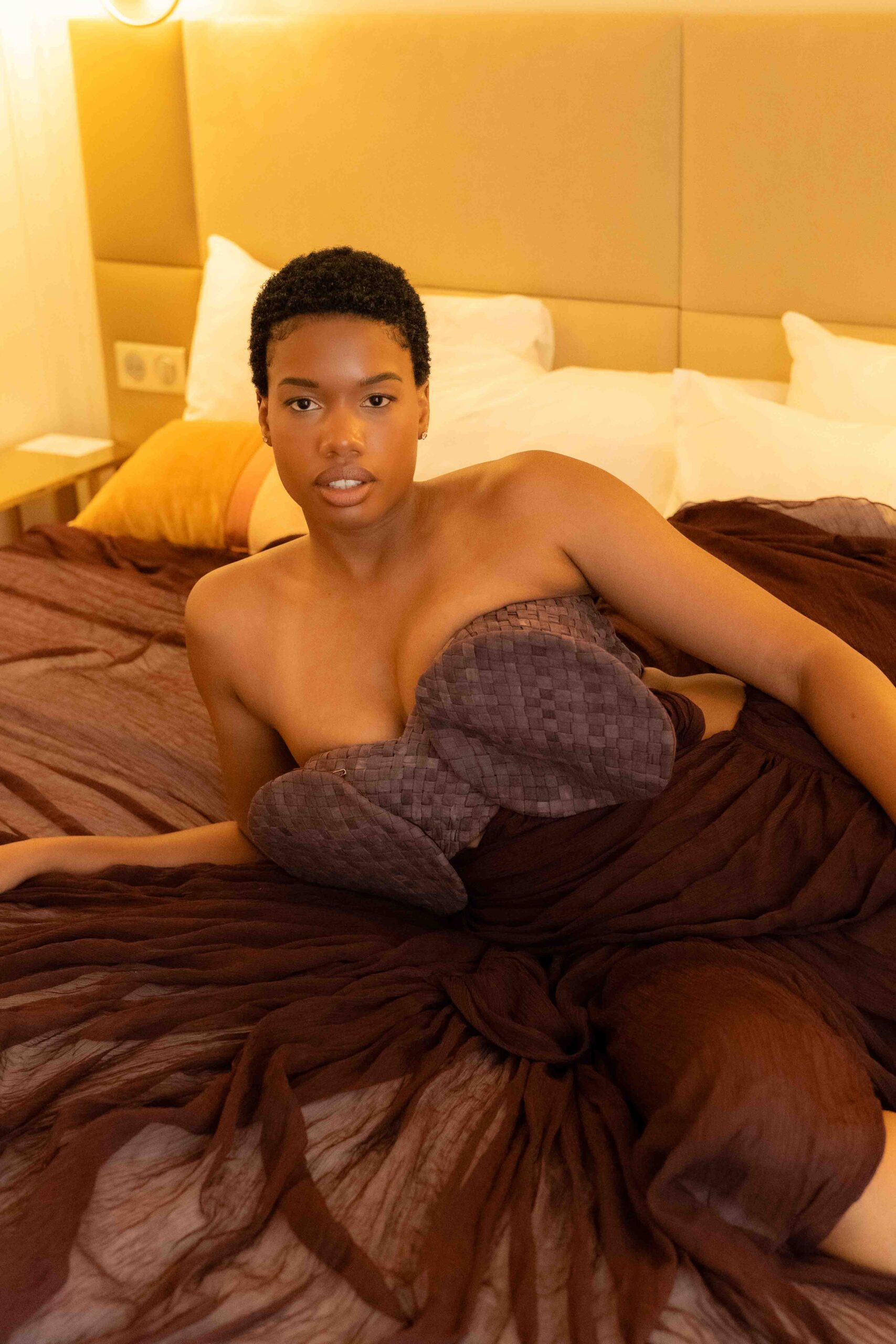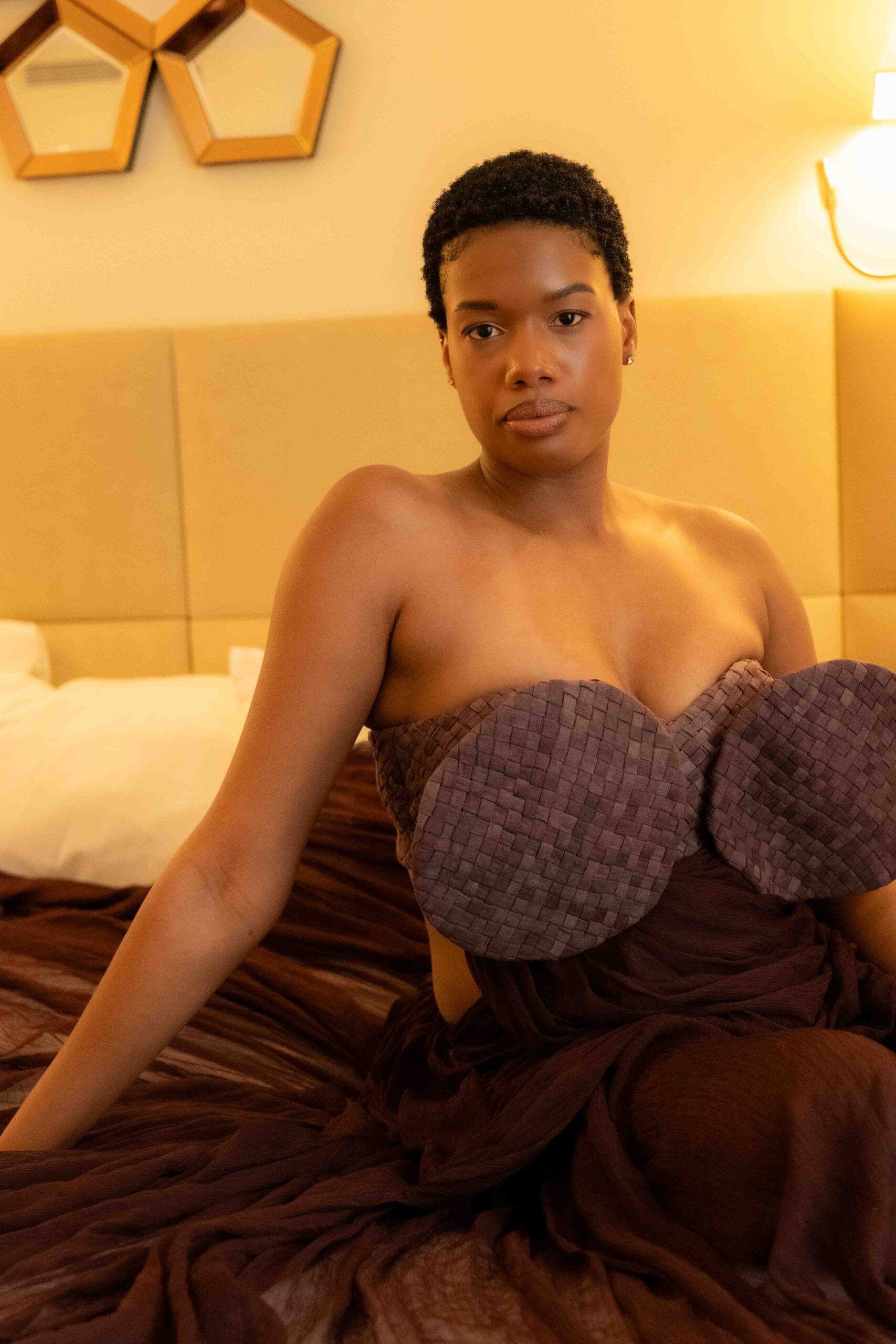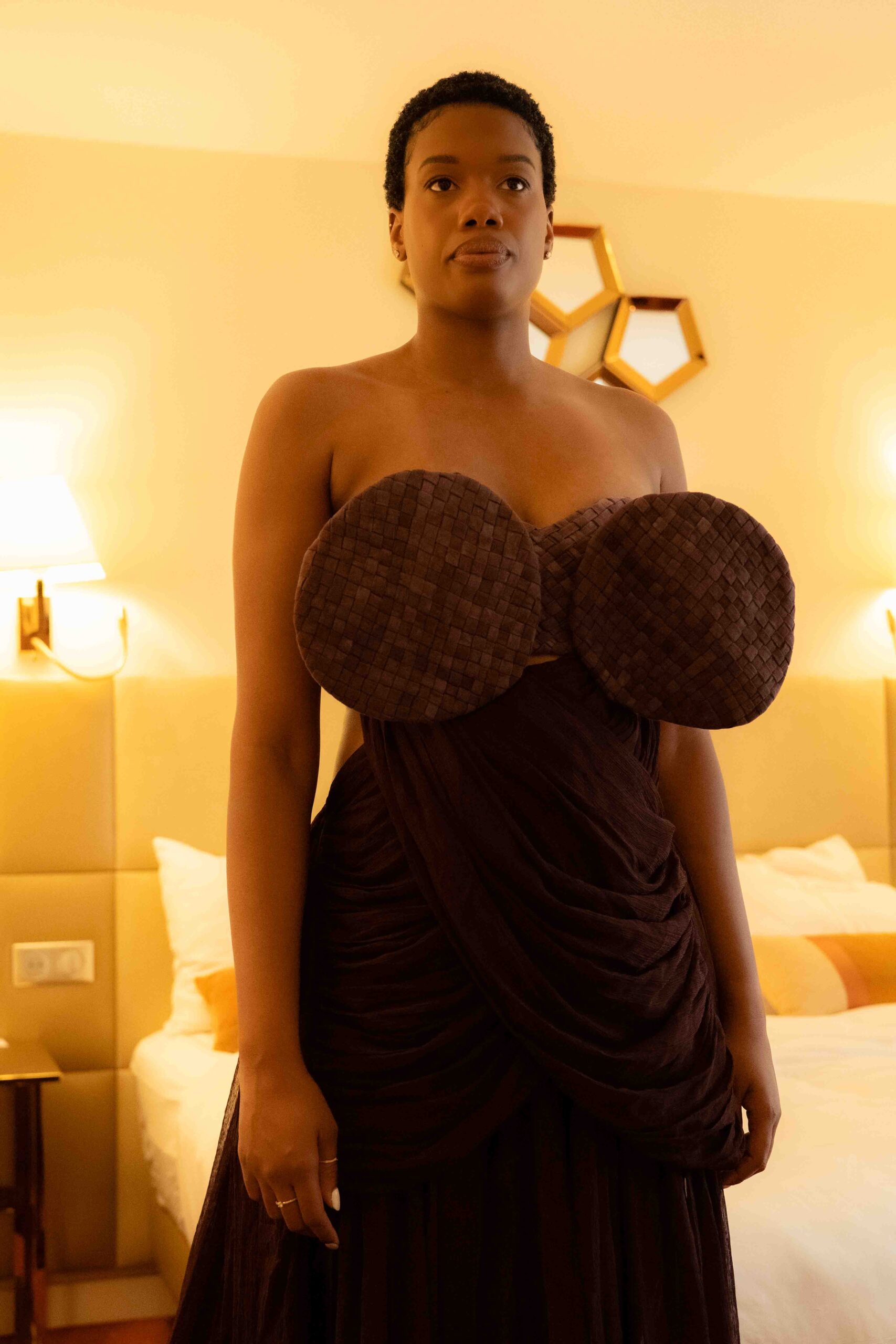 Robe de cérémonie Kroskel en mousseline Bordeaux, majestueuse et audacieuse, dotée de grandes oreilles éléphant tissées et d’un bustier structuré. Une pièce théâtrale qui célèbre la femme puissante, libre et rayonnante.